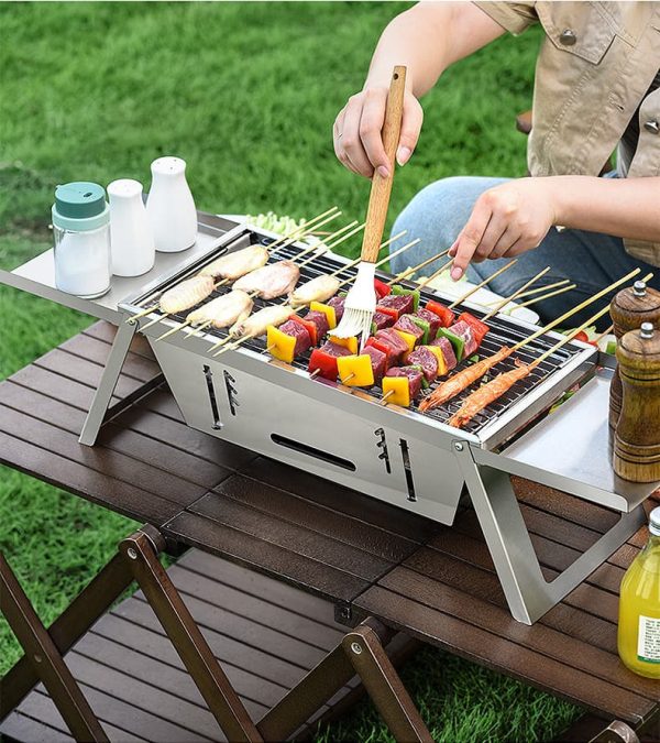Parrilla portátil plegable de acero inoxidable, resistente al calor, fácil de transportar.